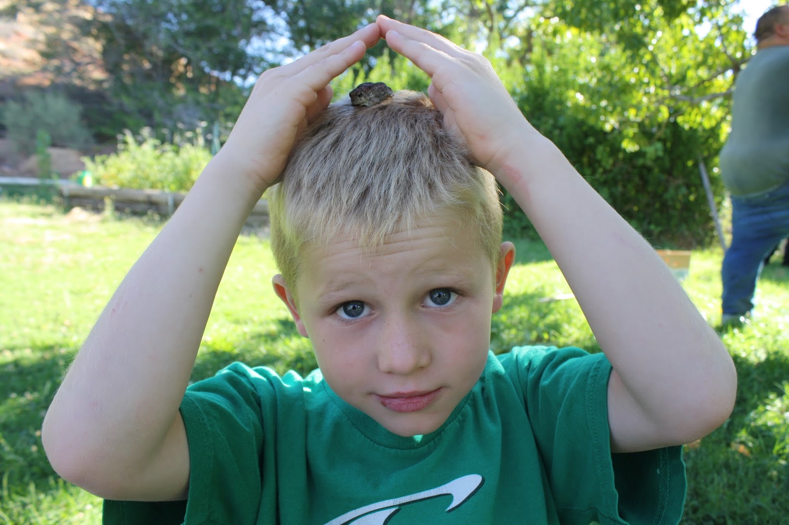 Notice on Oak's head...his nice little frog. The picture's above are in Gunlock at Guy and Gertrude's home. Gertrude has passed away, but Guy is pictured above with Ryan. Ryan claims that he has great memories of Gunlock, and Aunt Gertrude was the only woman who would cook their craw-dad's for them. She is Grandma Bodel's sister. Anyhow, I loved their place! It was shady, and green and beautiful. We had a great day with Grandpa Bundy!