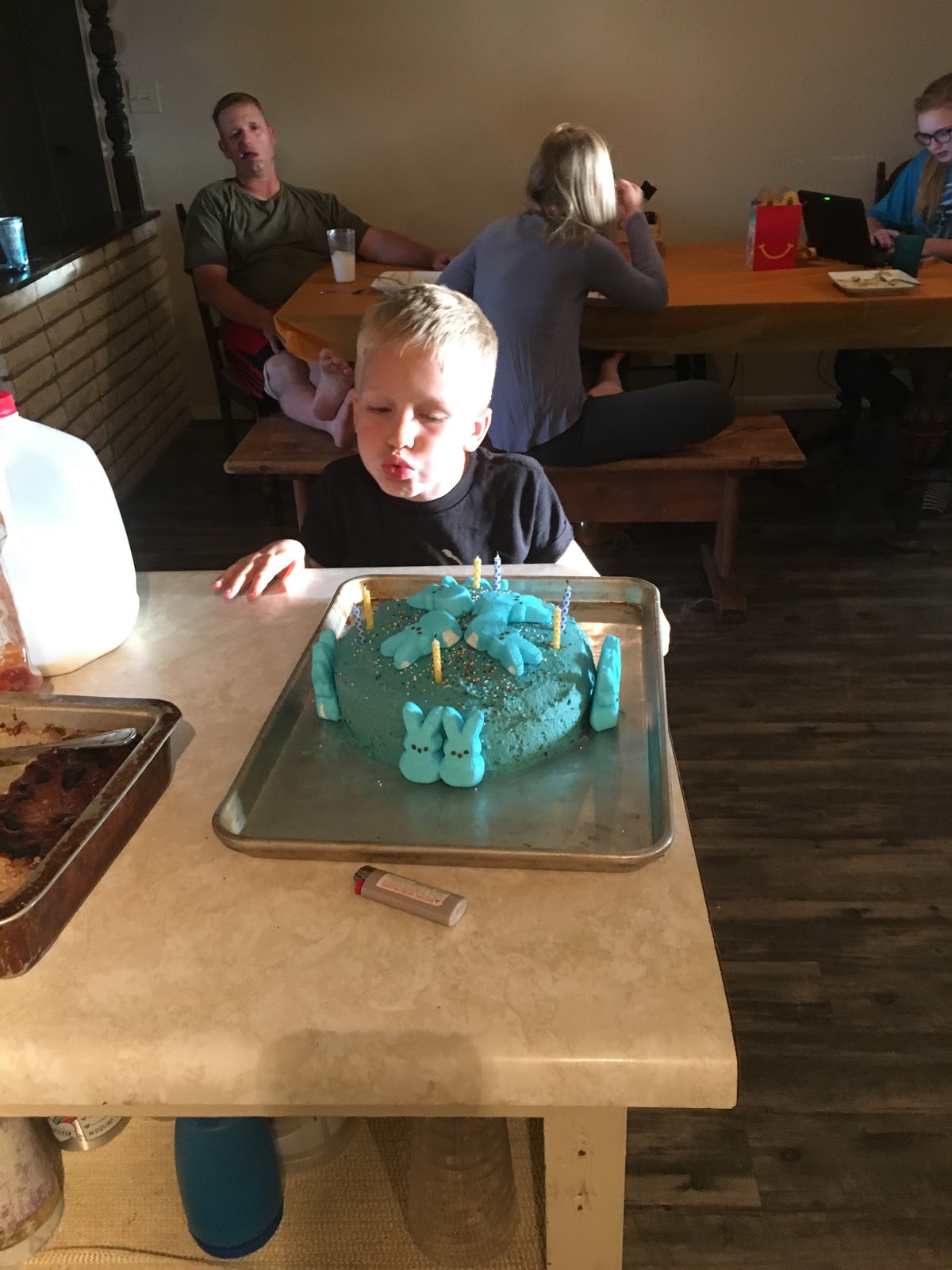 Moroni turned seven in the midst of all of the craziness. He had given me a list weeks ago, and yet I had paid very little attention to it. Of course, all of the sudden, we had the fair, and all of the packing it entails, and my little dude's birthday. He also asked me to bring donuts to his class. I had to look all over town because he basically had asked for a whole conglomeration of stuffed animals. Seriously, Dill and I pretty much hit every store in the valley, and other than a stuffed wolf, we found them all. I had previously attempted to frost a fancy cake for Carol's birthday. Ryan and Jazz laughed at how ridiculous it looked for days and days. It made me feel like I had to redeem myself, and Moroni's cake did look much better. Whipped cream frosting was a big hit. He liked his gifts, his classmates liked the donuts, and his birthday went well. Mo isn't too difficult to please.
